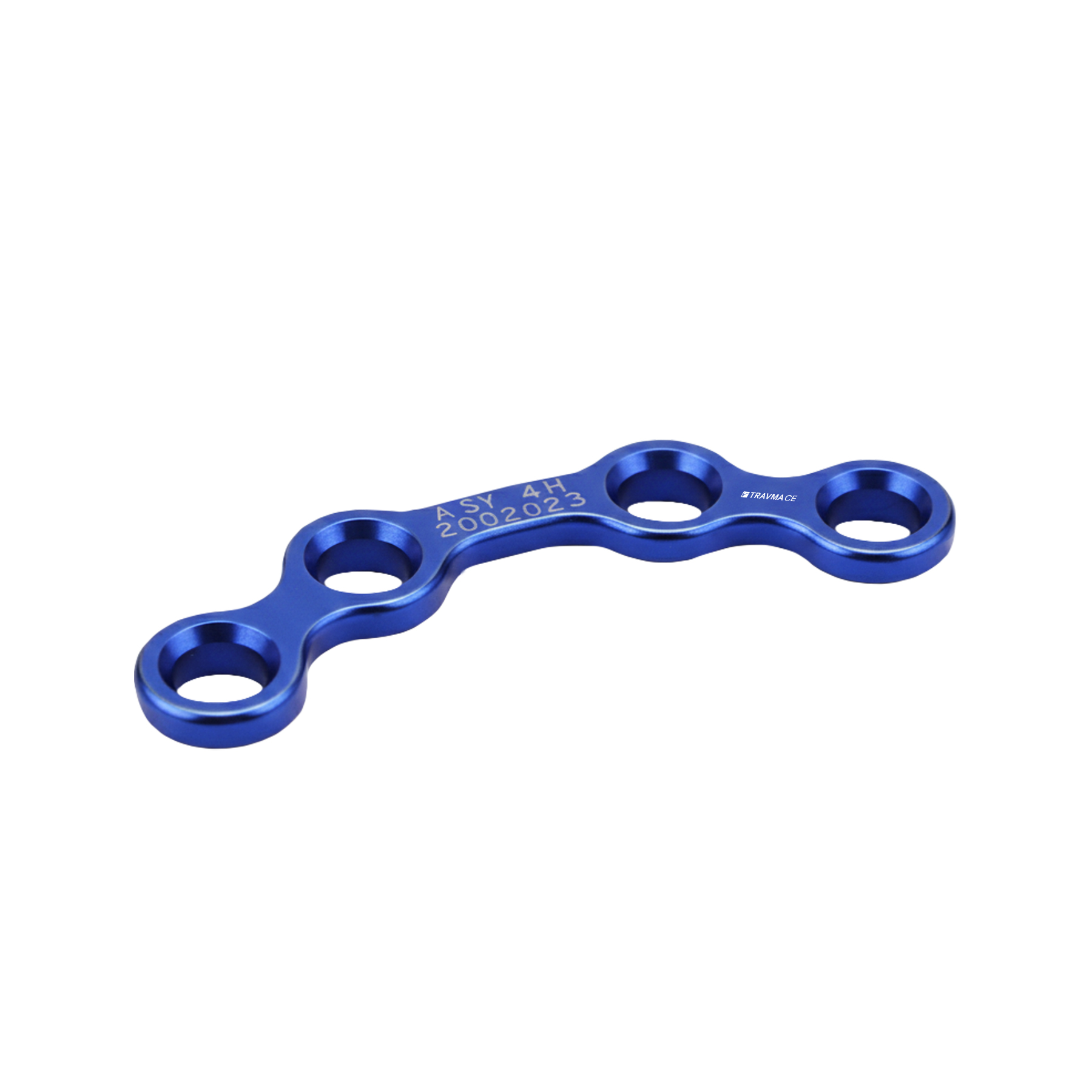 Mini placa curva con puente para maxilofacial, diseñada para tornillo 2.0mm, cuenta con 2 orificios redondos a cada lado del puente, perfil 1.0mm, fabricada en titanio.