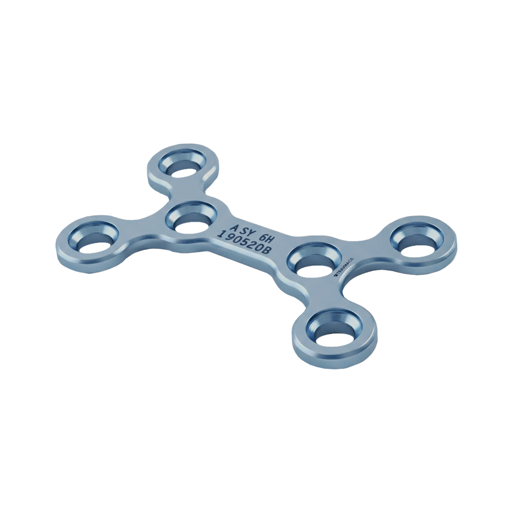 Mini placa doble «Y» para maxilofacial, diseñada para tornillo 2.0mm, cuenta con 3 orificios redondos de cada lado (6 orificios totales), perfil 0.8mm, fabricada en titanio.